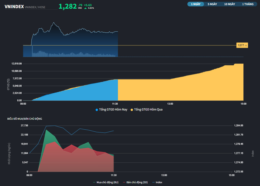 ➢ Kết thúc phiên giao dịch sáng 25/08, VNI ở mốc 1282.79 tăng +5.79 điểm :