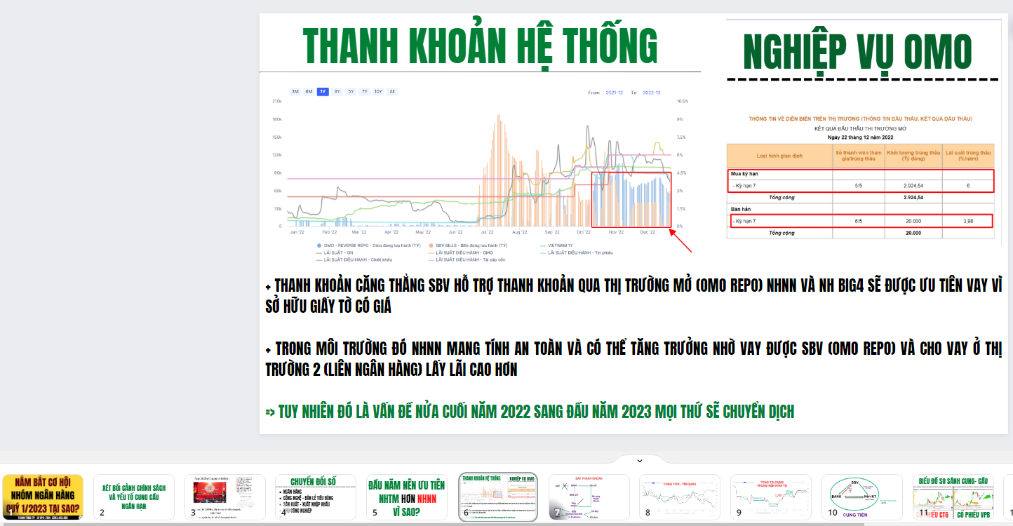 Nhìn lại bức tranh toàn cảnh tất cả sự kiện tài chính trên quốc tế và Việt Nam năm 2022. Dữ liệu cuối năm 2022 trả về dự báo là tương đối khó khăn và thách thức giai đoạn nửa đầu năm 2023 về tăng trưởng kinh tế, tuy nhiên ở mặt trận khác thị trường tiền tệ sẽ có cơ hội lớn cải thiện “NỚI LỎNG THANH KHOẢN” phù hợp cho thị trường tài chính chứng khoán dễ thở hơn. Chúng ta cùng theo dõi và bóc tách với nhau vấn đề này anh chị nhé