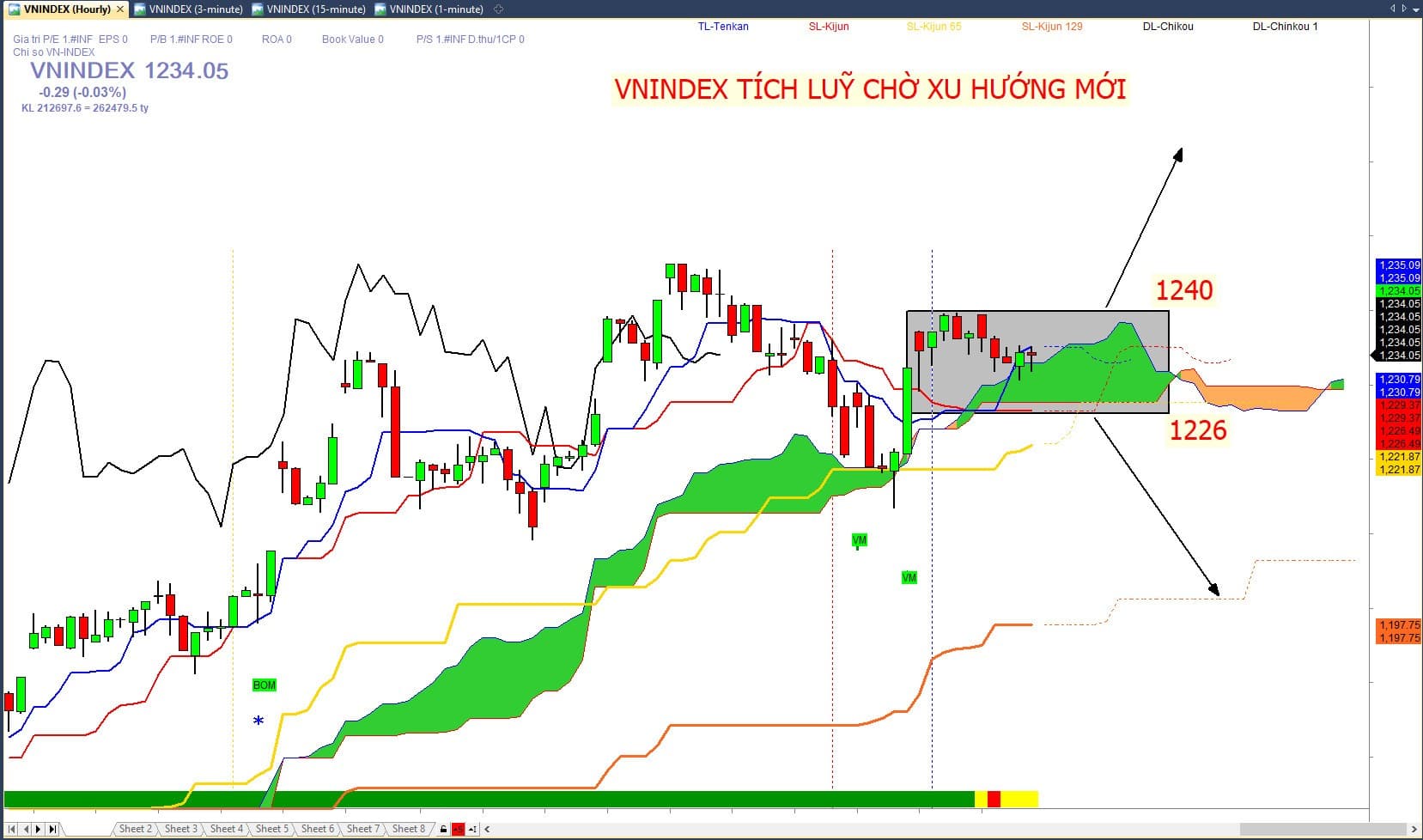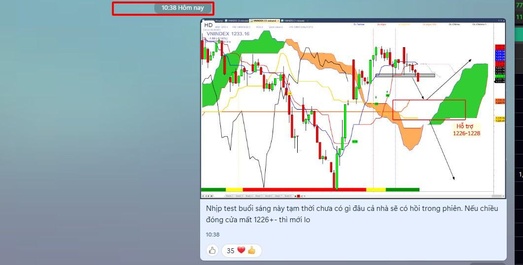- Kịch bản tích cực: Trong trường hợp thị trường kết phiên thứ 2 nằm trên 1228± thì thị trường sẽ an toàn đến cuối tuần cụ thể là đến chiều thứ 5, mục tiêu hướng về vùng đỉnh cũ 1246±