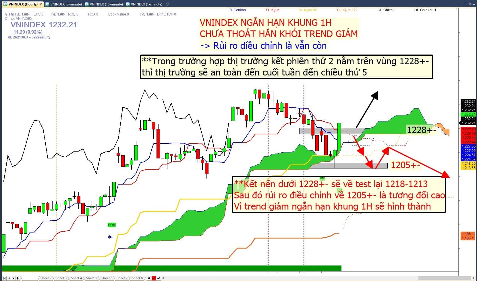 - Kịch bản tiêu cực: Kết nến dưới 1228± sẽ quay về test lại 1218-1213. Sau đó rủi ro điều chỉnh về 1205± là tương đối cao, vì “TREND GIẢM” ngắn hạn khung 1H sẽ hình thành từ đó sẽ tác động khung DAILY không có xu hướng tích cực và vùng 1205± cũng là vùng cực kỳ quan trọng