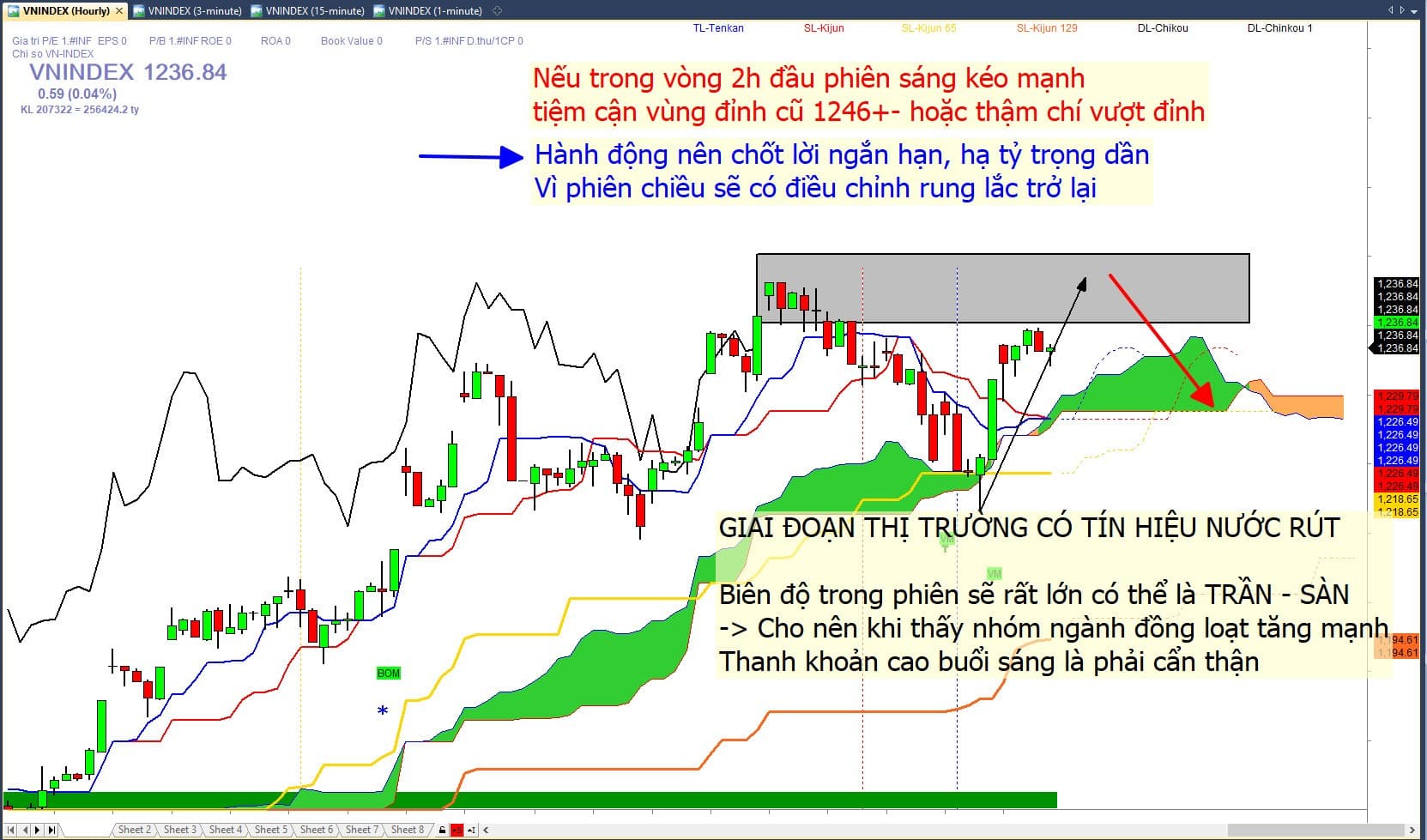 - Nếu trong vòng 2h đầu phiên sáng kéo mạnh tiệm cận vùng đỉnh 1246± hoặc thậm chí vượt đỉnh và thị trường đồng thuận tăng mạnh