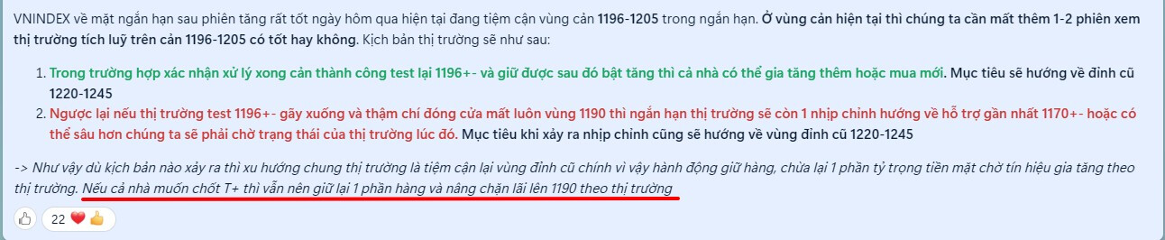 → Như vậy dù kịch bản nào xảy ra thì xu hướng chung thị trường là tiệm cận lại vùng đỉnh cũ chính vì vậy hành động giữ hàng, chừa lại 1 phần tỷ trọng tiền mặt chờ tín hiệu gia tăng theo thị trường. Nếu cả nhà muốn chốt T+ thì vẫn nên giữ lại 1 phần hàng và nâng chặn lãi lên 1190 theo thị trường