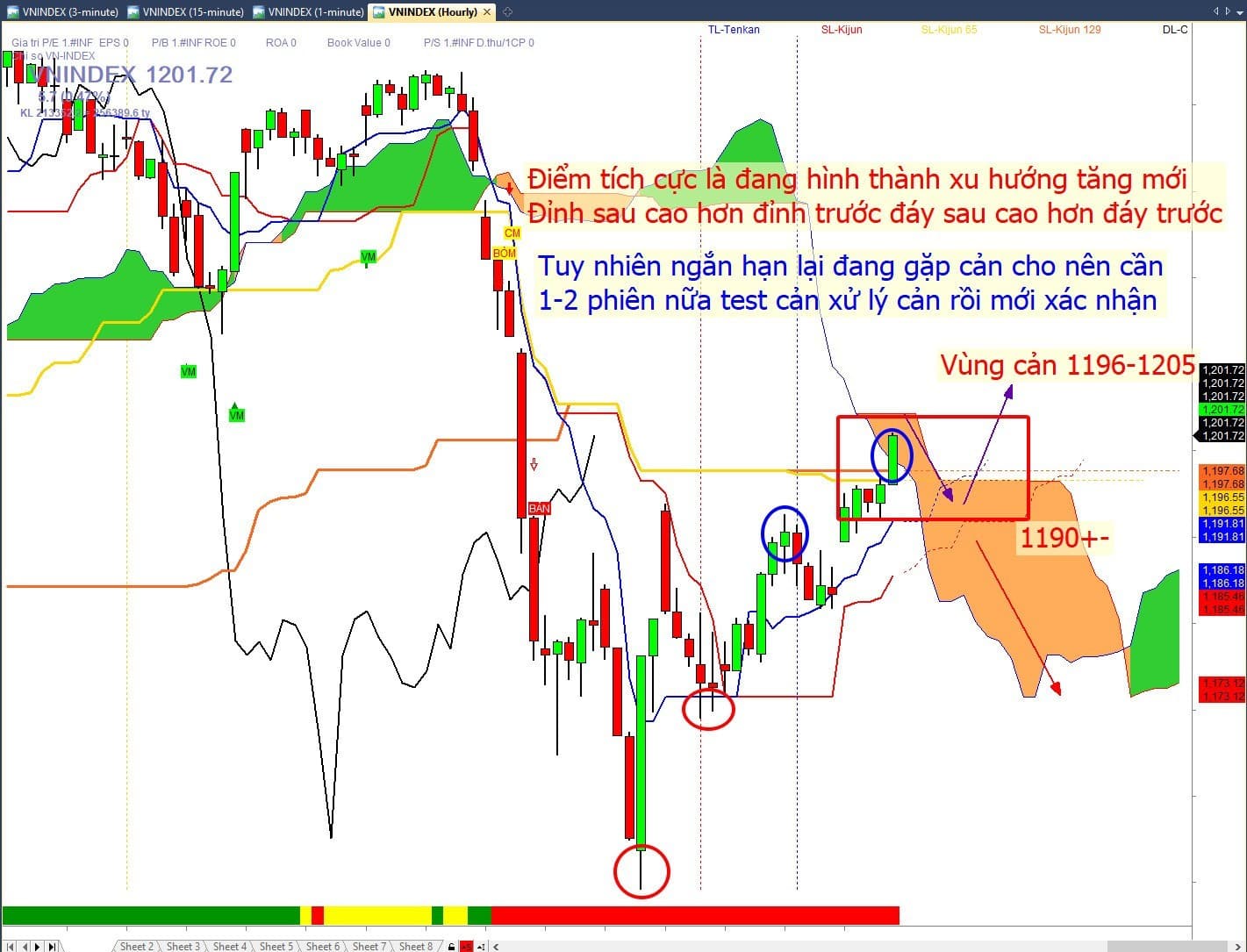 VNINDEX về mặt ngắn hạn sau phiên tăng rất tốt ngày hôm qua hiện tại đang tiệm cận vùng cản 1196-1205 trong ngắn hạn. Ở vùng cản hiện tại thì chúng ta cần mất thêm 1-2 phiên xem thị trường tích luỹ trên cản 1196-1205 có tốt hay không. Kịch bản thị trường sẽ như sau: