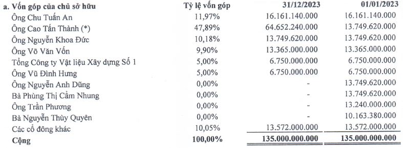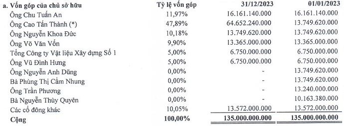 Tới cuối 2023, sở hữu vốn của Công ty có nhiều biến động. Danh sách thuyết minh chỉ thể hiện 1 cổ đông tổ chức là Tổng Công ty Vật liệu Xây dựng Số 1 (FICO), nắm 5% vốn.
