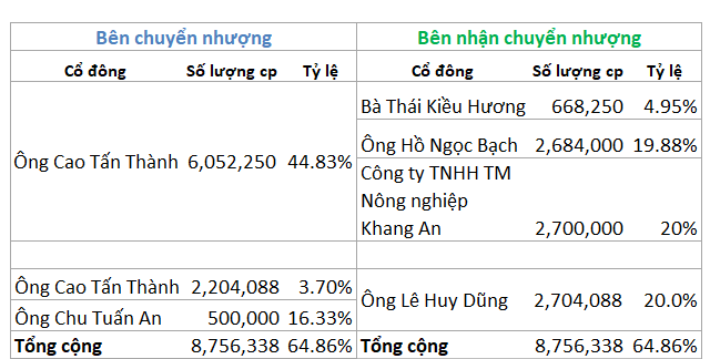Tổ chức nhận chuyển nhượng cổ phần là Công ty TNHH Thương mại Nông nghiệp Khang An, nhận 2.7 triệu cp, tăng đương 20% vốn.