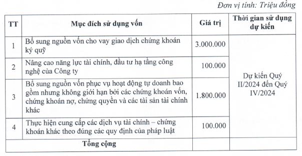 Nội dung đáng chú ý đầu tiên là kế hoạch chào bán riêng lẻ 500 triệu cp cho nhà đầu tư chuyên nghiệp trong quý 2-4/2024, tăng vốn điều lệ thêm 5,000 tỷ đồng. Giá chào bán 10,000 đồng/cp. Phần lớn số tiền thu về sẽ được bổ sung cho hoạt động cho vay ký quỹ (3,000 tỷ đồng), tự doanh (1,800 tỷ đồng).