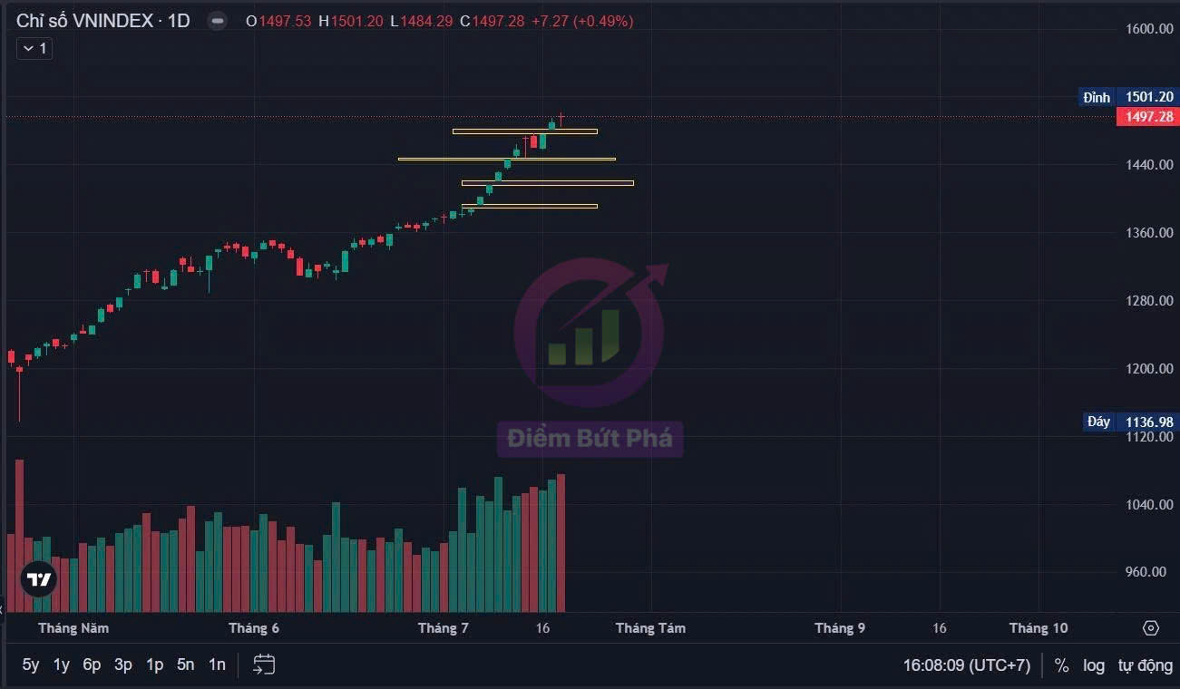 Trong ngắn hạn, thị trường sẽ xuất hiện nhịp rung lắc khi tiệm cận vùng đỉnh cũ quanh 1500 điểm. Tuy nhiên, theo đồ thị ngày, các chỉ báo như MACD hay RSI dù đang tiến dần vào vùng quá mua. Nhưng nếu vẫn ở vùng cao và chưa có dấu hiệu đảo chiều hay thanh khoản gia tăng nhưng chỉ số vẫn tiếp tục tăng điểm thì chưa có gì đáng lo ngại.