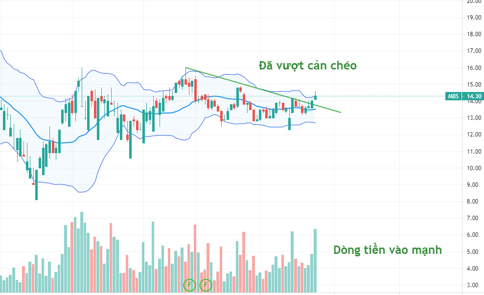 MBS: Hiện tại nhóm chứng khoán đang thu hút dòng tiền. MBS đã có dòng tiền vào mạnh ở phiên gần đây và đã vượt cản chéo.Mua tỉ trọng 30%-50% vùng 14-14.3.