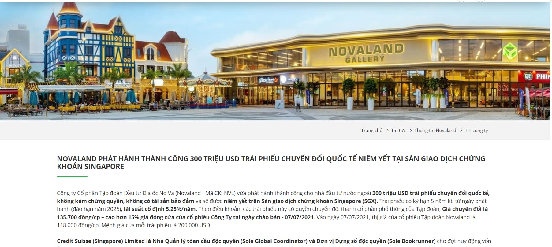 - Ngày 07/07/2021, NVL phát hành thành công cho nhà đầu tư nước ngoài 300 triệu USD trái phiếu chuyển đổi quốc tế, không kèm chứng quyền, không có tài sản bảo đảm và sẽ được niêm yết trên Sàn giao dịch chứng khoán Singapore (SGX).