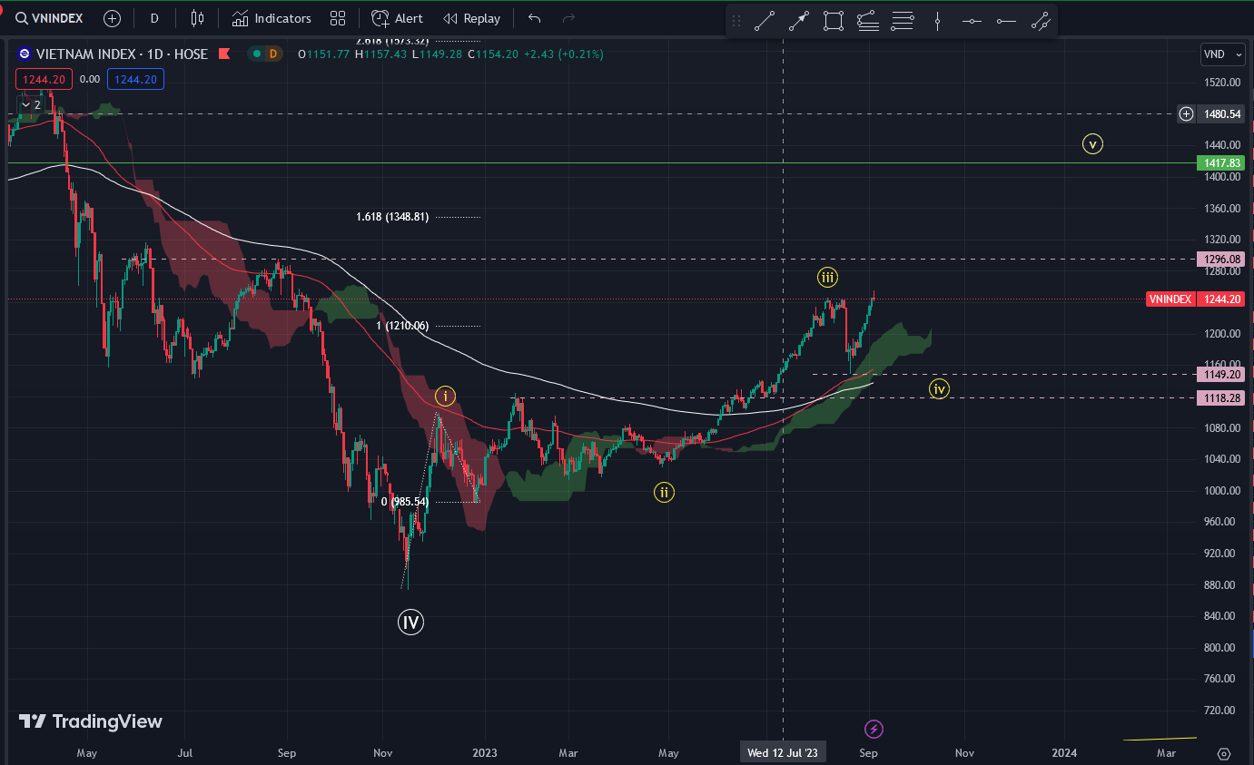 Về kinh nghiệm, thì bất cứ sóng 4 nào cũng đều đi khá “bất ổn” nên “có thể” kịch bản hồi về các đường trung bình (ema20 -1212 hoặc ema50 - 1186) để tạo đáy tăng dần hoặc vị trí 2 đáy khu vực ema100-1160 đều có thể xảy ra. Và nó vẫn là 1 xu hướng tăng tổng thể của chỉ số này.