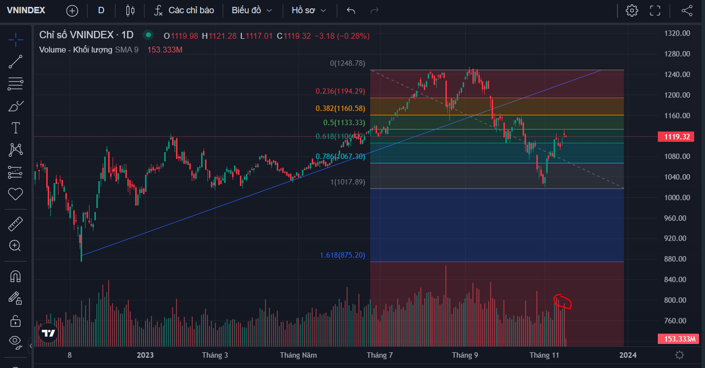 Vni ở vùng nhạy cảm. Nến tuần khá xấu. Nến ngày là nến nhấn chìm gap+ 3 nến trước đó. Volume hôm nay cũng rất to.