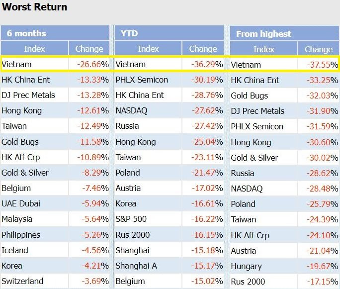 Từ đỉnh trên 1.500 điểm, VN-Index đã giảm 38% xuống dưới 950 điểm, mức thấp nhất kể từ tháng 11/2020. Mức giảm hơn 36% từ đầu năm cũng đã đưa chứng khoán Việt Nam trở thành thị trường giảm mạnh nhất thế giới. Độ rộng nghiêng hoàn toàn sang chiều giảm và gần như không có nhóm cổ phiếu nào ngược dòng.