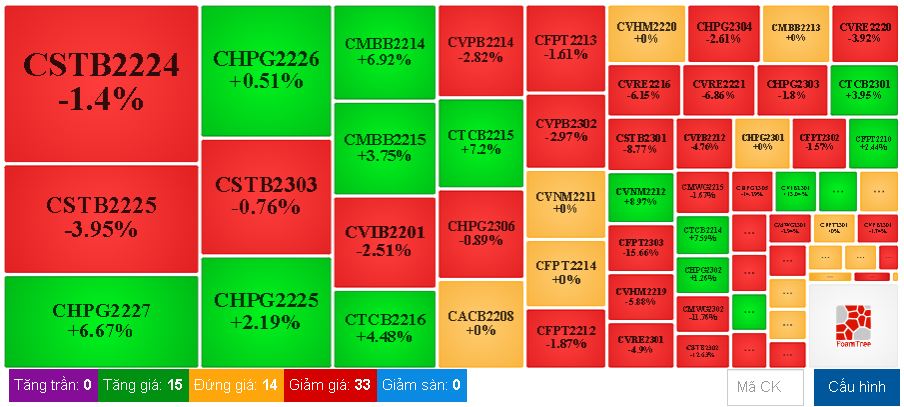 - CSTB2303 (-0.8%) và CHPG2225 (+2.2%) dẫn đầu thị trường đạt 1.6 tỷ và 736.6 triệu.