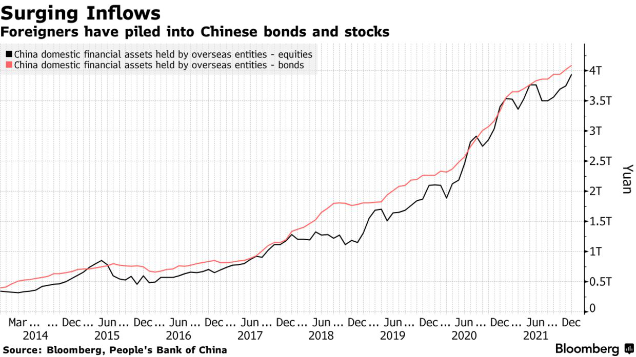 Trong thời gian tới, nhà đầu tư ngoại có thể sẽ thu về lợi nhuận lớn từ thị trường Trung Quốc. Từ đầu năm 2019 đến cuối năm 2021, tỷ lệ nắm giữ cổ phiếu trong nước của khối ngoại đã tăng hơn 242% lên 3,9 nghìn tỷ NDT (614 tỷ USD). Dòng vốn đổ vào thị trường trái phiếu của quốc gia này cũng tăng 129% lên 4,1 nghìn tỷ NDT.