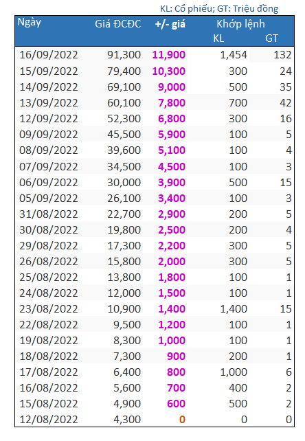 Tổng cộng, cổ phiếu này đã có 23 phiên liên tiếp đóng cửa ở mức giá trần từ ngày 15/8 đến 16/9. Dù vậy, cũng trong suốt thời gian này, thanh khoản chỉ dừng lại ở mức vài trăm đơn vị khớp lệnh/phiên.
