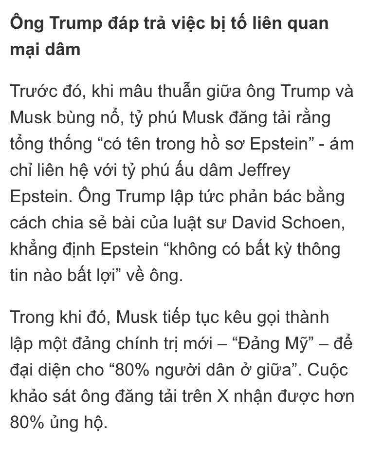 Vấn đề là Musk tham vọng. Có tiền nhưng muốn có quyền lực nữa mà bị rào cản k thể đứng ra tranh cử tổng thống (vì bản thân là ng nhập cư Mỹ từ Nam Phi, hiến pháp k cho phép ng nhập cư tranh cử).