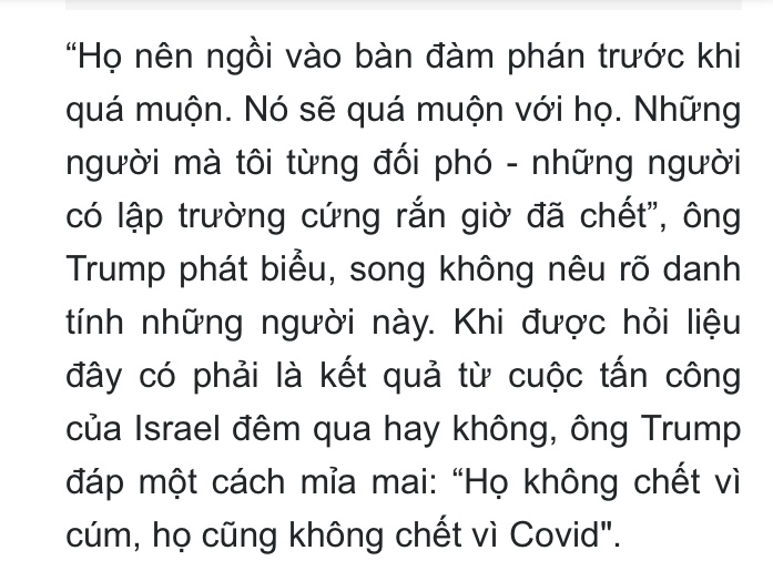 Chơi với ng thiếu kiên nhẫn như Trump thì ngay và luôn cú một, khó chơi bài dây dưa: "tôi đã cho họ (Iran) 60 ngày quyết định và hôm nay là ngày 61 (Israel phủ đầu)