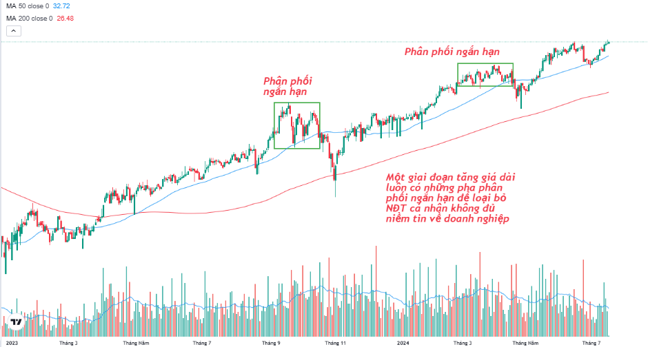 Trong một xu hướng tăng trung hạn hoàn toàn có thể xuất hiện các giai đoạn phân phối và giảm giá nhằm loại bỏ Nhà đầu tư cá nhân không đủ niềm tìn về doanh nghiệp.