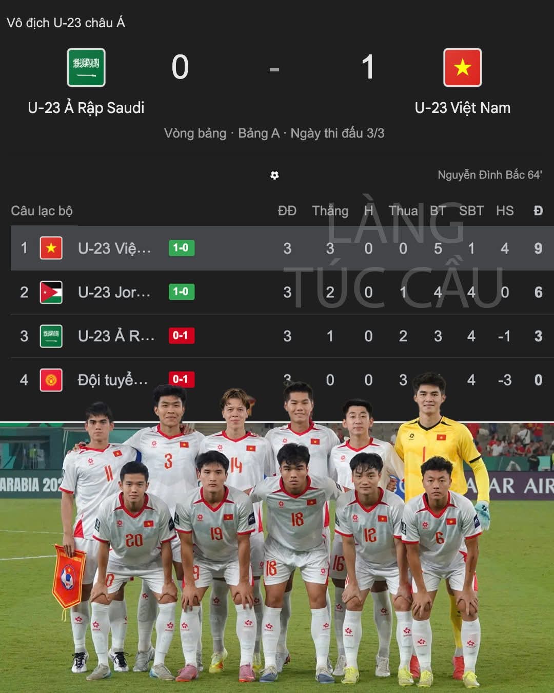 U23 Việt Nam giành chiến thắng 1-0 trước U23 Saudi Arabia, qua đó góp mặt ở tứ kết với ngôi nhất bảng A sau 3 trận toàn thắng.