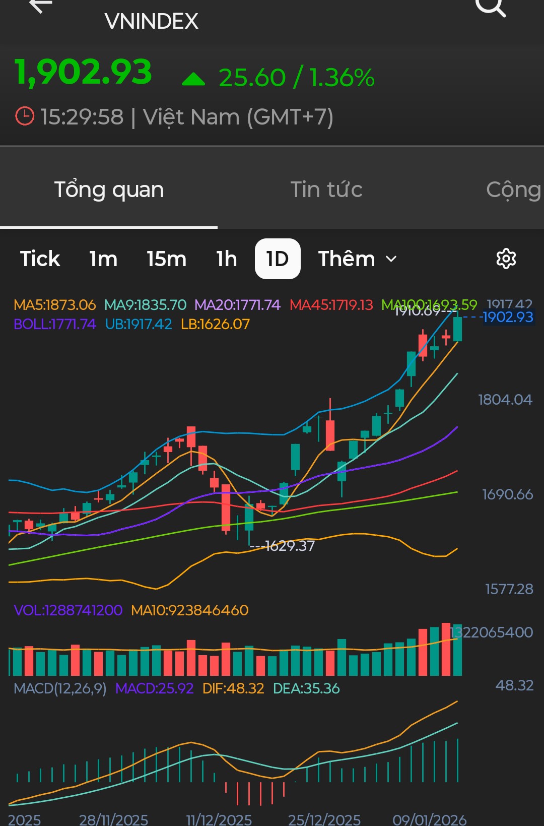 Như vậy thì nay thị trường vẫn ổn, Véc ni vẫn trong sóng Nonstop tăng kiểu DJ- Đi Dây (đu dây) vì có sự lan tỏa, 1 số cổ (NH, CK) tăng bù nên phải rụt cổ hoặc đan xen xanh đỏ (k mở kịp bolinger) nhưng nhìn chung thị trường sẽ xanh liên tục giữ trend tăng đến tầm 2K rồi có khi mới chỉnh.