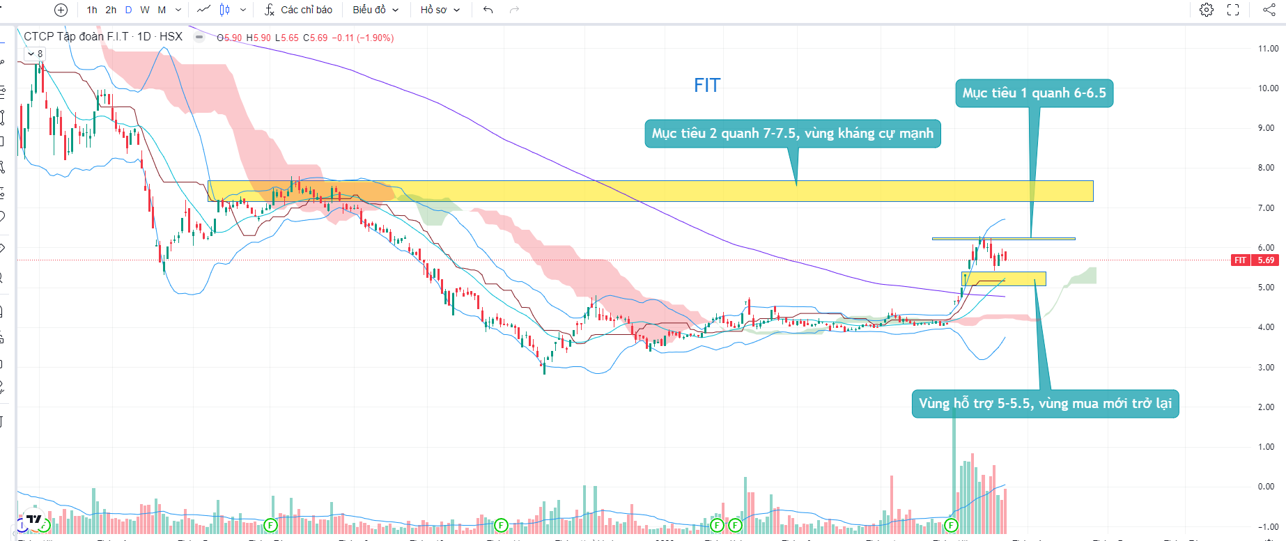 FIT sau thời gian tích lũy dài đã có nhịp tăng rất ấn tượng, tăng hơn 43% kể từ vùng nền. Nhịp tăng của FIT tiền vào rất điều, nến xanh chiếm ưu thế hoàn toàn so với nến đỏ. Với nhịp kéo mạnh vừa qua thì FIT đang đi chậm lại, tích lũy quanh vùng giá 5-5.5 tương ứng với đường MA20 ngày, đây tạm thời gọi là vùng hỗ trợ ngắn hạn của FIT.