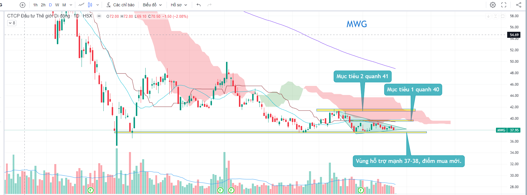 Điểm hạn chế của MWG hiện tại tín hiệu tăng chưa có, nhưng để giảm thêm là rất thấp. Bạn quan tâm cứ túc tắc mua gom dần chờ giá lên, dòng tiền quay trở lại.