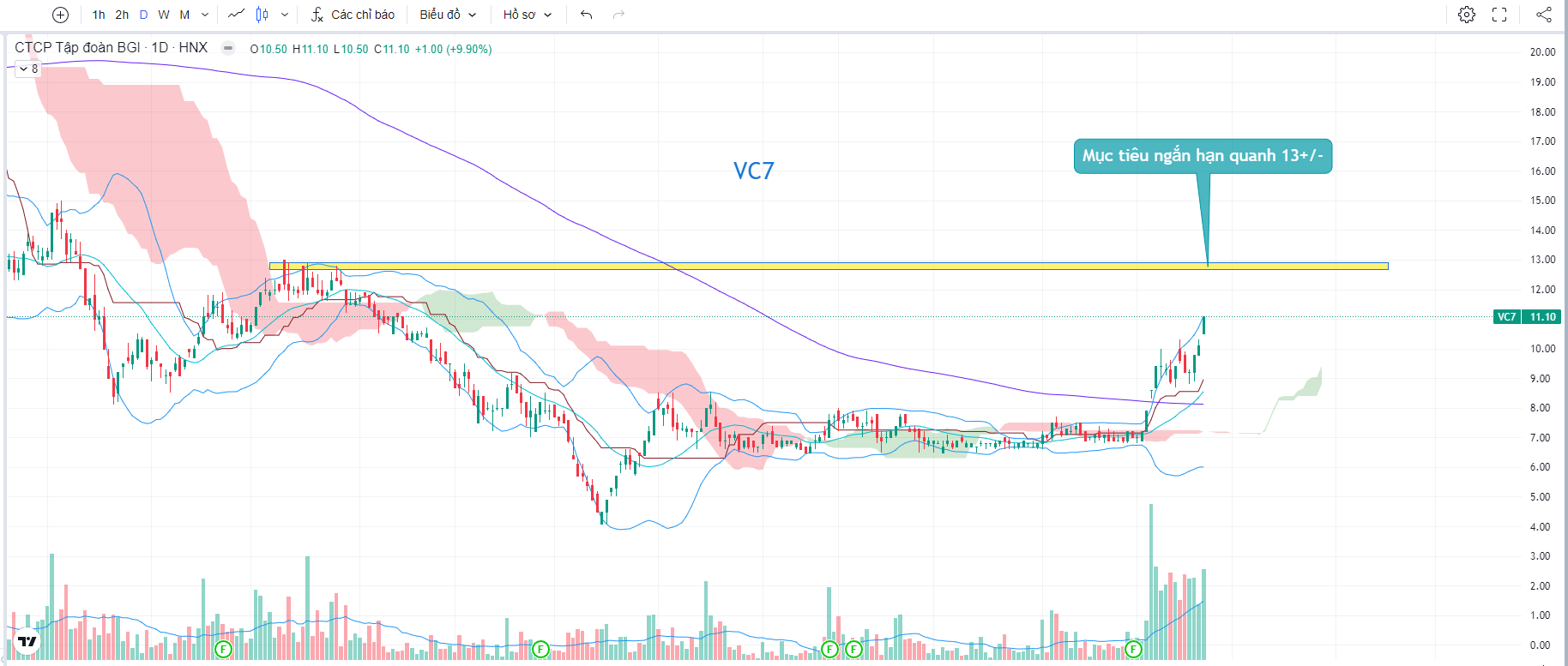 VC7 hôm nay tăng trần rất dứt khoát và rất sớm. Giá đóng cửa cao nhất ngày và hình thành nến tăng điểm không râu trên, râu dưới cho thấy bên mua đang rất mạnh và chiếm ưu thế hoàn toàn. Với trạng thái tăng giá kiểu này, anh có thể giữ cổ phiếu hết tuần này. Vì với kiểu tăng này, giá cổ phiếu sẽ còn đi tiếp. Anh chỉ chốt lời khi cổ phiếu có đà tăng suy yếu, giá tạo đỉnh, hình thành các mẫu hình nến doji, ngôi sao, nên thân nhỏ, MACD có tín hiệu phân kỳ, RSI rơi vào vùng quá mua,… với vùng giá hiện tại anh không nên mua thêm mà canh chốt lời.