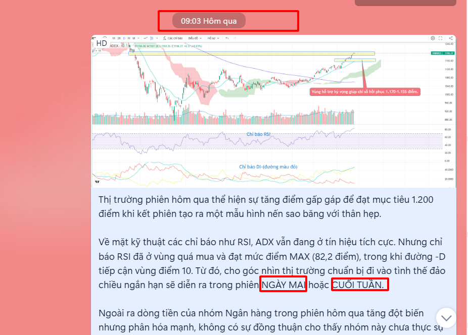 Ngoài ra các chỉ báo kỹ thuật RSI ở vùng quá mua và gần đạt MAX (80,1 điểm), nên mặc dù thể hiện VN-Index đang rất mạnh nhưng sẽ khó tăng trưởng vượt qua vùng 1.200 điểm nhanh chóng, ngoài ra các chỉ báo ADX, +D và -D có dấu hiệu của việc tạo đỉnh ngắn hạn. Vùng hỗ trợ dự kiến cho nhịp điều chỉnh lần này trong khoảng 1.150-1.160, hoặc có thể lên cao hơn nếu dòng tiền vẫn duy trì mạnh.