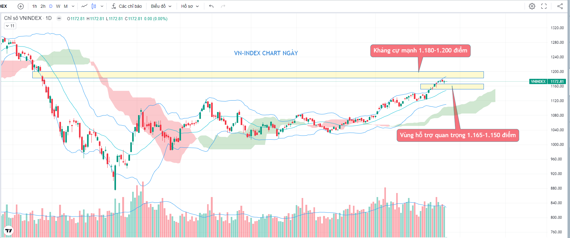 Hiện tại chỉ số VN-Index đang đi vào vùng GAP 1.190-1.200 đây là ngưỡng kháng cự mạnh nên VN-Index được dự báo sẽ khó vượt qua được trong thời gian ngắn và cần tích lũy đủ để bứt phá qua.