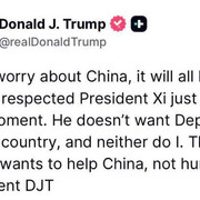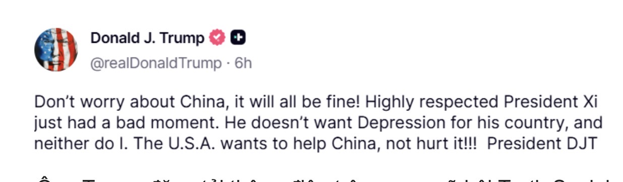 Đừng lo lắng về Trung Quốc, mọi chuyện sẽ ổn thôi! Chủ tịch Tập – người rất được tôn trọng – chỉ vừa trải qua một khoảnh khắc khó khăn. Ông ấy không muốn đất nước mình rơi vào khủng hoảng, và tôi cũng vậy. Hoa Kỳ muốn giúp Trung Quốc, không phải làm hại họ!!! Tổng thống DJT