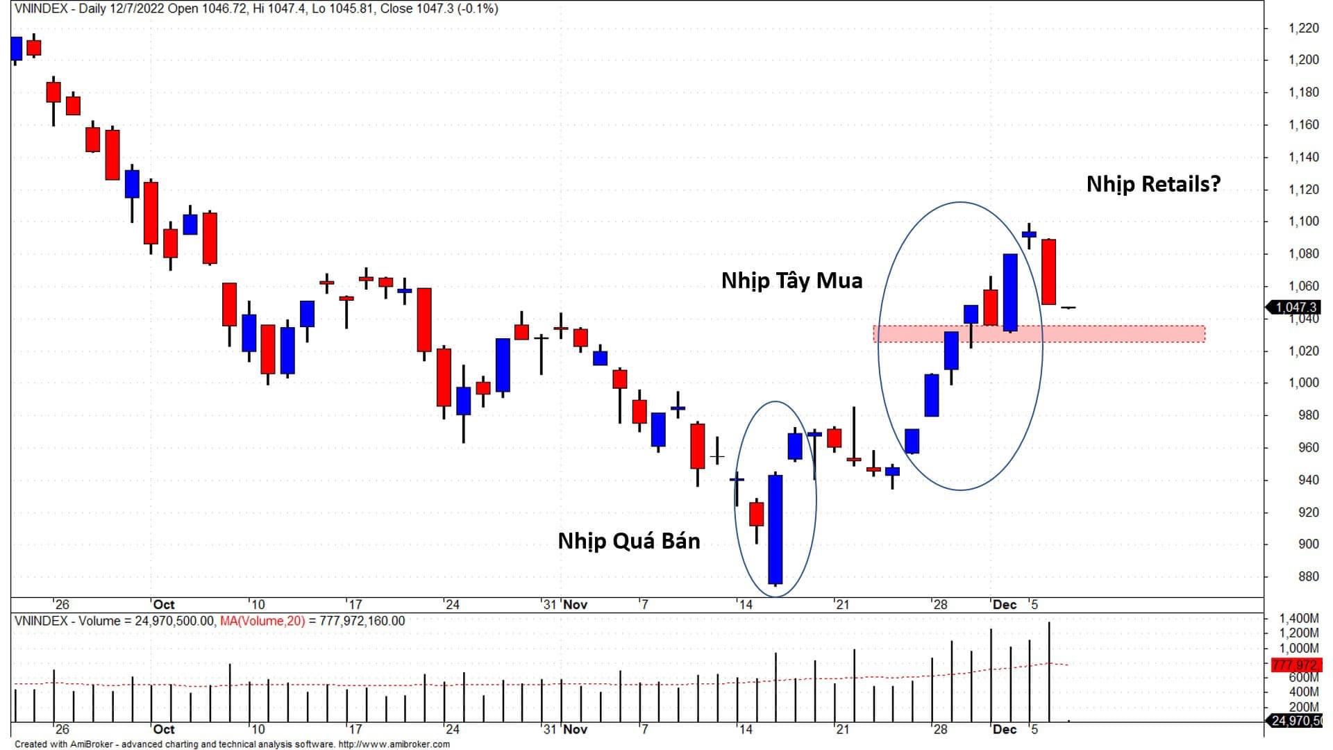Thị trường đã hồi vượt kỳ vọng khi bối cảnh thế giới & trong nước có nhiều cải thiện trong ngắn hạn. Từ đáy, đã có 2 nhịp chính, gọi theo ngôn ngữ bình dân là Nhịp Quá Bán & Nhịp Tây Mua. Nhịp quá bán, với những người mua như mình, kỳ vọng khiêm tốn 1,000 cuối năm thôi. Nhưng khối ngoại Mua khiếp quá, có thời điểm lên đến 1,100 - Nhịp Tây Mua.
