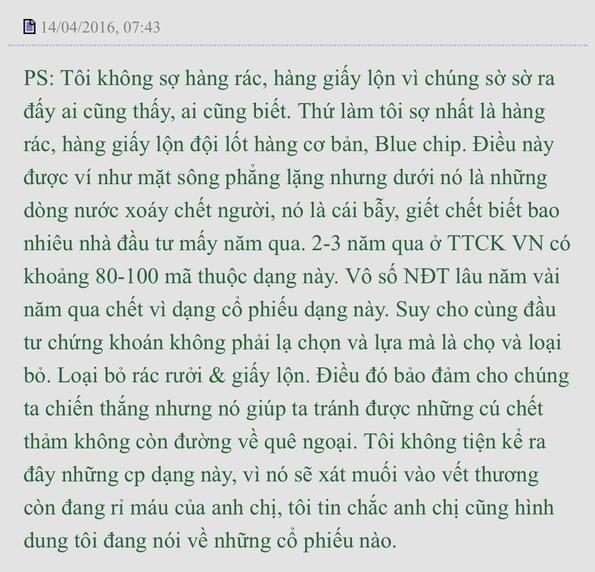 Đã qua rồi cái thời cờ bạc dạo. Giờ người khôn của khó. Thời của tiền rẻ qua rồi. Giờ phải đãi cát tìm vàng thôi ạ. Phải đổ mồ hôi, sôi nước mắt lùng sục từng con số trong BCTC các DN chất lượng, tăng trưởng mạnh, ngành nghề đang gặp thời thế thuận lợi để bùng nổ trở mình thành DN lớn trong ngành.