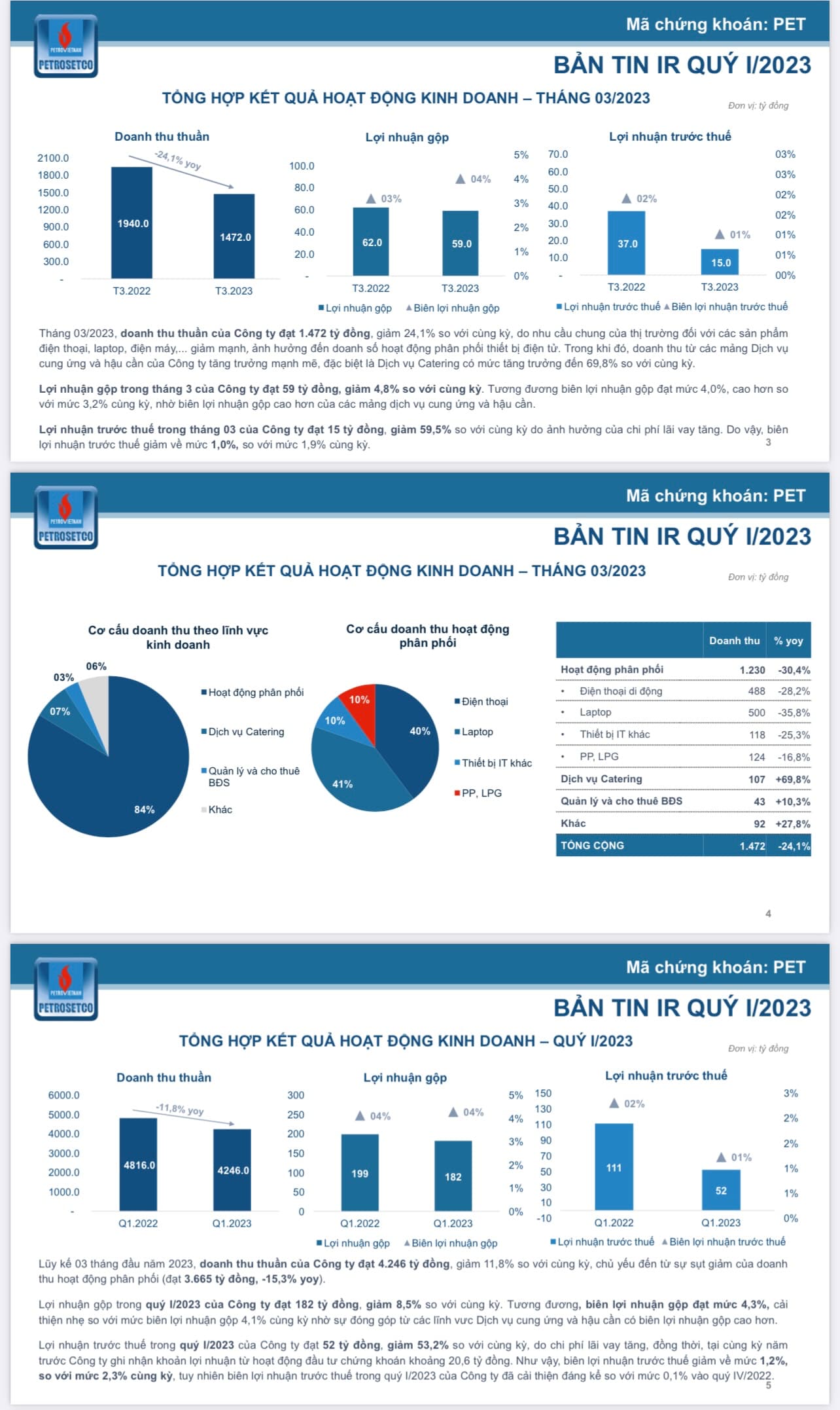 Tháng 03/2023, doanh thu thuần của Công ty đạt 1.472 tỷ đồng, giảm 24,1% so với cùng kỳ, do nhu cầu chung của thị trường đối với các sản phẩm điện thoại, laptop, điện máy,… giảm mạnh, ảnh hưởng đến doanh số hoạt động phân phối thiết bị điện tử. Trong khi đó, doanh thu từ các mảng Dịch vụ cung ứng và hậu cần của Công ty tăng trưởng mạnh mẽ, đặc biệt là Dịch vụ Catering có mức tăng trưởng đến 69,8% so với cùng kỳ.
