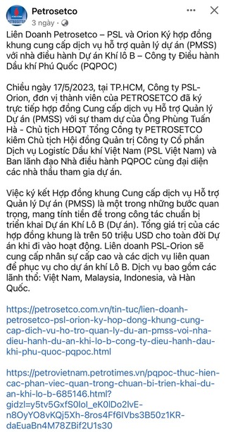 Việc ký kết Hợp đồng khung Cung cấp dịch vụ Hỗ trợ Quản lý Dự án (PMSS) là một trong những bước quan trọng, mang tính tiền đề trong công tác chuẩn bị triển khai Dự án Khí Lô B (Dự án). Tổng giá trị của các hợp đồng khung là trên 50 triệu USD cho toàn đời Dự án khi đi vào hoạt động. Liên doanh PSL-Orion sẽ cung cấp nhân sự cấp cao và các dịch vụ liên quan để phục vụ cho dự án khí Lô B. Dịch vụ bao gồm các lãnh thổ: Việt Nam, Malaysia, Indonesia, và Hàn Quốc.