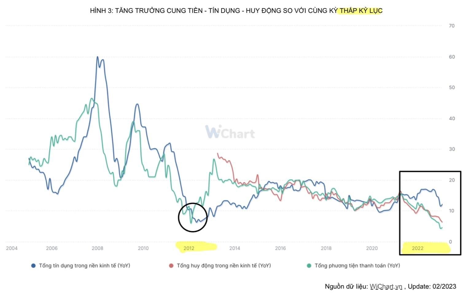 Về phía sức cầu trong nước suy yếu, nguyên nhân sâu xa của cái này chính là sự “vỡ trận” của thị trường tài chính và thị trường bất động sản trong nước khi tiền rẻ không còn và “đốt” quá đà. Chỉ cần 2 thị trường này phục hồi thì tiêu dùng sẽ nhanh chóng phục hồi, tín dụng khơi thông, tâm lý thoải mái, bất chấp sản xuất vẫn lục đục. Giờ thấy anh em than còn hơn cả hồi lockdown do Covid. Muốn chứng khoán và bất động sản hồi phục thì chỉ có 1 cách duy nhất lúc này, đó là thực hiện đồng bộ cả 3: giảm lãi suất, bơm tiền, mở pháp lý. Hiện nay lãi suất đã giảm nhưng đó là lãi suất điều hành, lãi suất cho vay vẫn giảm rất chậm, “trên bảo dưới mới chỉ hơi nhích mông”. Cung tiền ghi nhận mốc tăng trưởng thấp kỷ lục [HÌNH 3]. Chính sách pháp lý thì mới xử lý bề nổi, cấp cứu, bề chìm vẫn phải chờ. Nhìn chung thì nếu nhìn cả 3 yếu tố trên không khó để đưa ra kết luận: “Vẫn cần phải chờ, khó khăn vẫn còn tiếp nối trong những tháng tới”. Vấn đề này sẽ phải mổ xẻ sâu hơn ở kỳ 2 “lãi suất - bơm tiền”. Còn về chính sách tài khoá: Giảm thuế VAT, đẩy đầu tư công,… cũng chỉ là “tiêm thuốc giảm đau” câu thêm giờ.