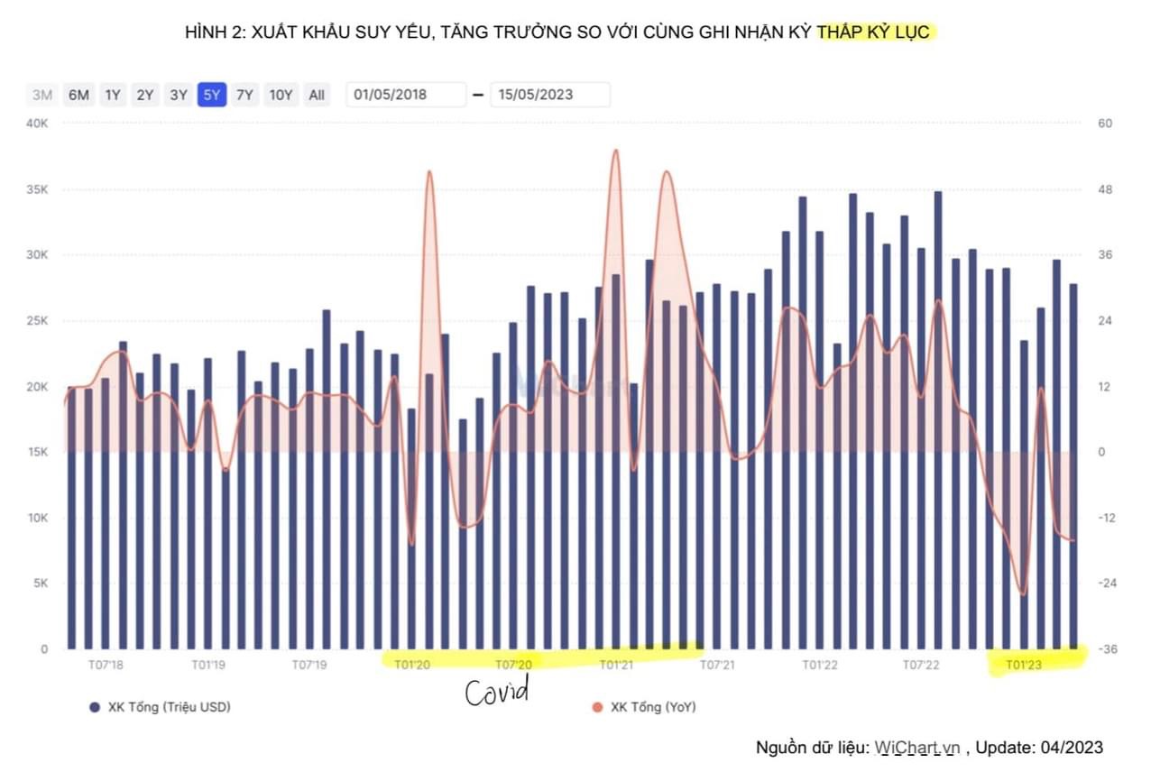 Sự chậm lại của sản xuất và tiêu dùng toàn cầu đã làm xuất khẩu trong nước suy giảm kỷ lục, sự suy giảm này lại chủ yếu đến từ những mặt hàng chủ lực của Việt Nam như: thiết bị điện tử, dệt may, thuỷ sản,… Nhu cầu bên ngoài suy giảm, nhưng sức mua trong nước cũng yếu đi rất rõ tại các mặt hàng có gia trị gia tăng cao như: Ôtô, tiêu dùng cao cấp, thiết bị điện tử,… Phần còn lại là các mặt hàng thiết yếu, tuy có tăng trưởng nhưng khá chậm nên cũng không thể bù đắp lại sự suy giảm nhanh chóng của sức cầu nói chung.