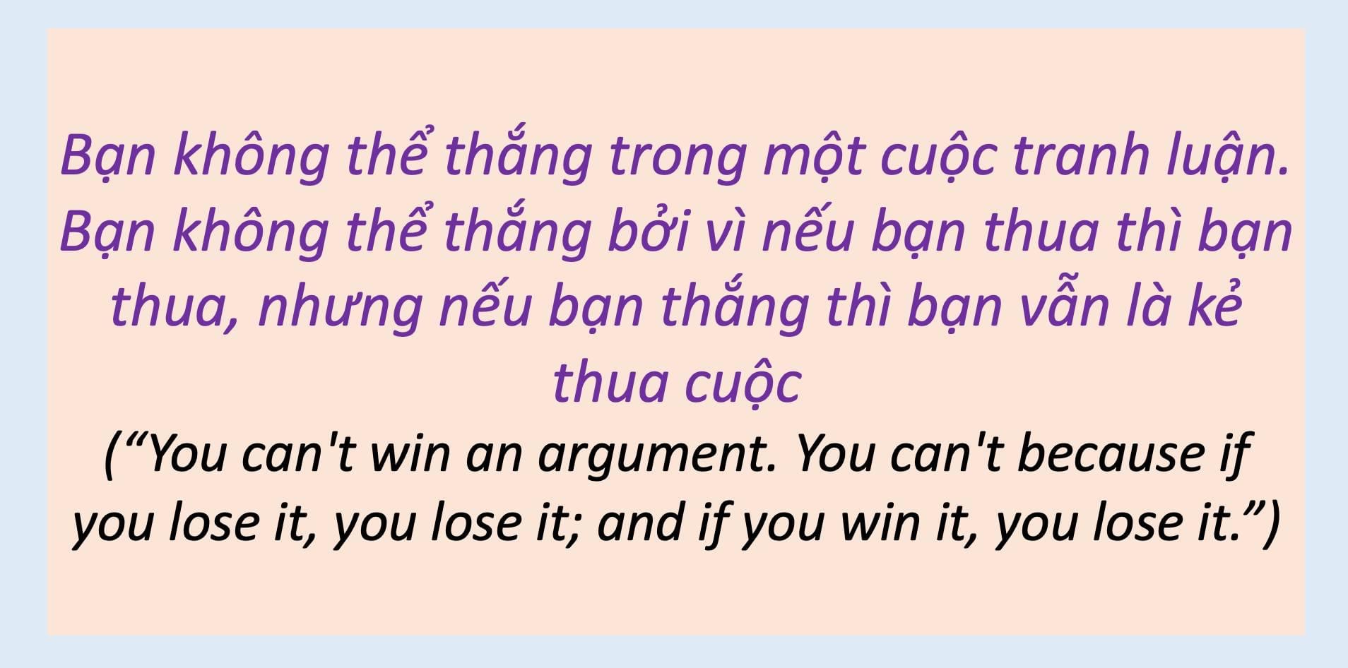 Bạn không thể thắng trong một cuộc tranh luận. Bạn không thể thắng bởi vì nếu bạn thua thì bạn thua, nhưng nếu bạn thắng thì bạn vẫn là kẻ thua cuộc.