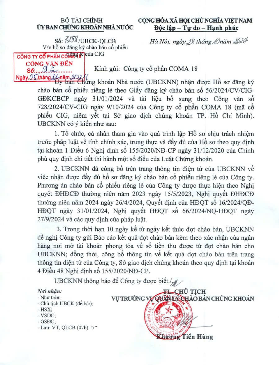 Theo Công văn số 7258/ UBCK-QLCB về việc đăng ký chào bán cổ phiếu riêng lẻ ngày 05/ 11/ 2024