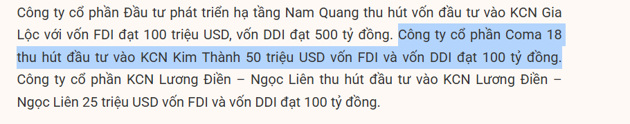 Videc nó còn đang cho Cig góp vốn vào làm kcn An Hưng Đại Bản 450ha nữa. Kcn này còn to hơn kcn Kim Thành rất nhiều và đây là một game lơn tiếp theo game kcn Kim Thành đấy bạn nhé. Game này mới chỉ đang mập mờ thông tin chứ chưa lộ tin ra ngoài nhiều.