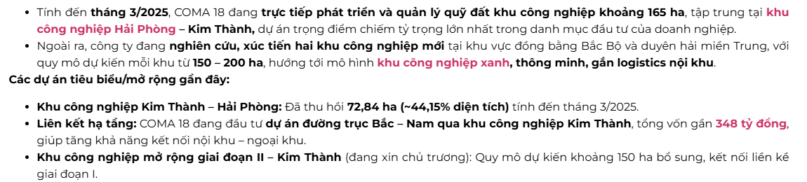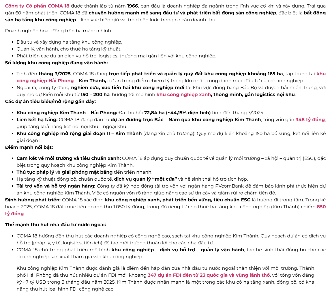Ngoài Kcn Kim Thành rất ngon đang làm ra thì Coma18 sẽ xin đầu tư mở rộng thêm 150ha. Với Coma18 cũng đang chuẩn bị đầu tư thêm hai khu công nghiệp nữa nhé. Nếu mọi thứ đúng như kế hoạch thì Coma18 sẽ trở thành một trong những doanh nghiệp lớn về khu công nghiệp.