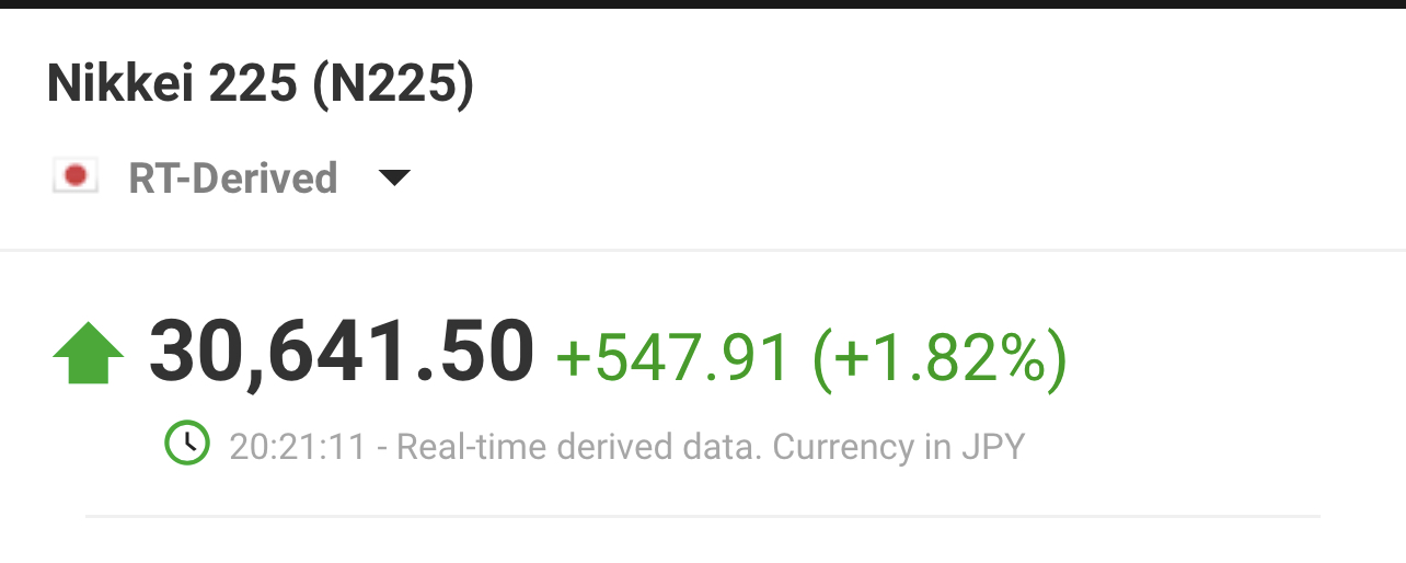 Nikkei của Nhật Bản sáng nay tiếp tục tăng mạnh, đây là chuỗi tăng mạnh 5 phiên liên tiếp đưa chỉ số này áp sát đỉnh lịch sử (chỉ còn khoảng 150 điểm nữa thôi). CK Nhật tăng cũng một phần nhờ nđt NN đang đổ bộ vào TT này: