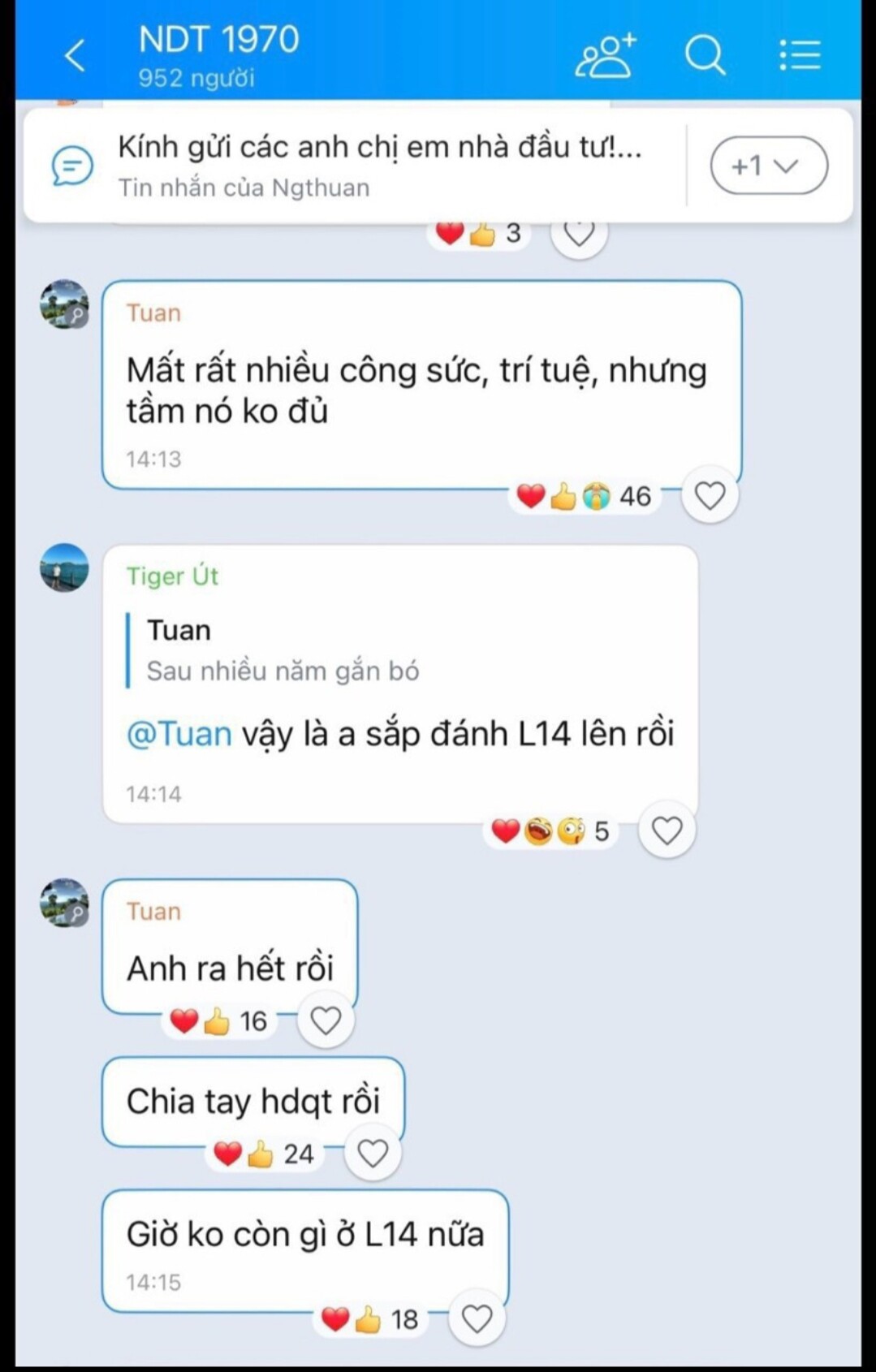 A7 bị đẩy khỏi L14 và xác nhận chia tay L14 rồi nhá, cổ phiếu L14 cũng bán sạch rồi ( có chút cay cú Chủ tịch L14). Hình như có nói đâu đó chia tay cả Dig rồi vì ko tin Thiện Tuấn. Chỉ còn Ceo thôi.