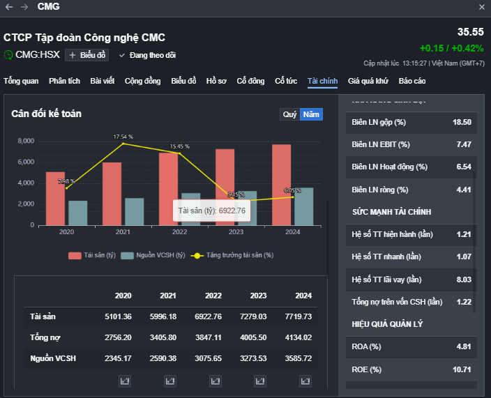 Tài sản của CMG tính đến quý 3/2025 là 8500 tỷ tăng từ mức 5100 tỷ năm 2020 và tăng 700 tỷ so với quý 2/2025: Có thể CMG đã đưa vào vận hành thêm mảng kinh doanh mới hay như là tài sản đầu tư cơ bản dở dang của quý trước đã hình thành và đưa vào sử dụng (lát chúng ta sẽ cùng tìm hiểu chỗ này)