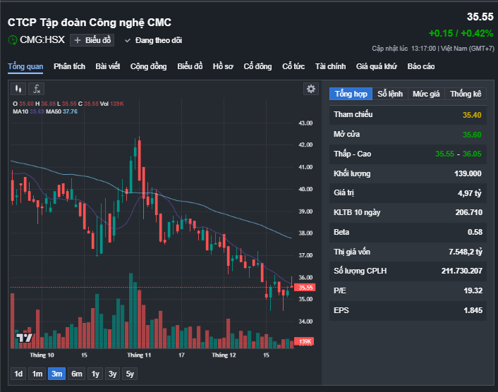 hình ảnh đồ thị giá của CMG từ 2020 đến 2025 giá tăng từ 15 lên 65 duy trì tại 45-52 trước khi điều chỉnh về vùng giá hiện tại 35.000/CP