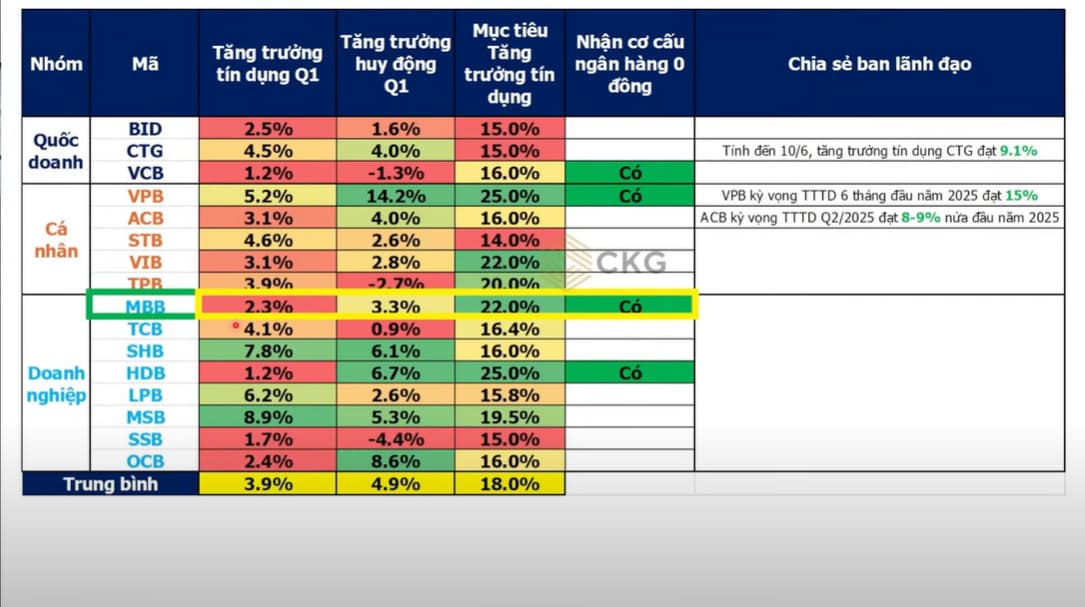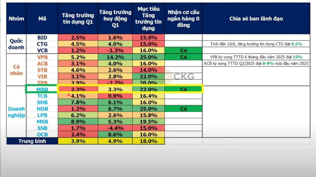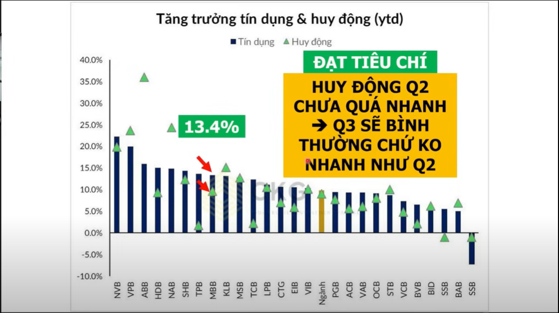 Nhìn từ sang phải trong bức tranh Tăng trưởng tín dụng & huy động(ytd), có thể giải thích được vì sao giá cổ phiếu thuộc nhóm Ngân hàng thương mại vừa và nhỏ tăng bỏ xa đàn anh VCB BID và CTG.