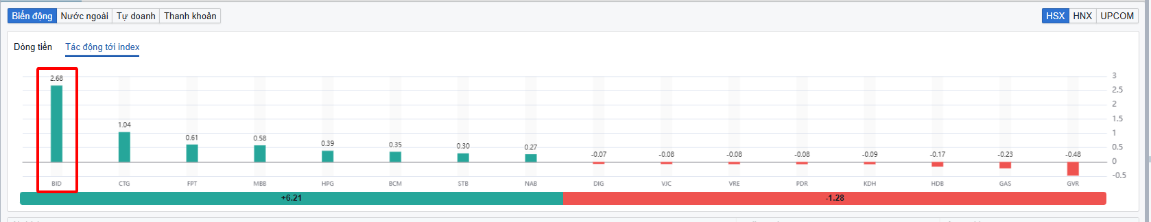 Một mình BID đóng góp hơn 2,5 điểm cho VN-Index trong số gần 7 điểm tăng sáng nay. BID là cổ phiếu vốn hóa đứng thứ 2 thị trường chỉ sau VCB, vị trí thứ 3 thuộc về FPT.