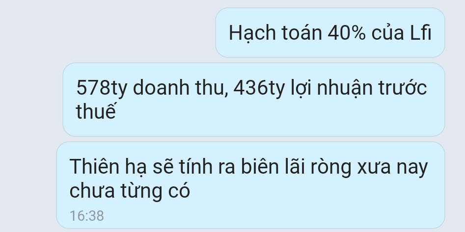 LFI anh em cũng giỏi nhưng lấy LN 1000 tỉ năm nay nhân lên ra định giá thì không ổn. Đầu tư tài chính cũng như BĐS, không dùng PE. Năm nay LFI lãi 1000, năm sau lỗ là chuyện thường.