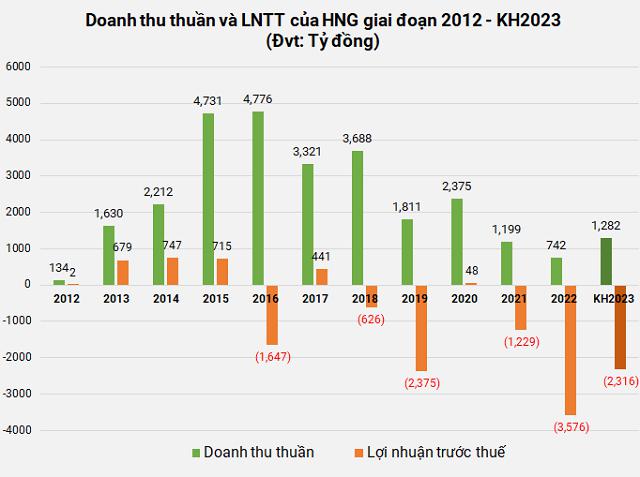 Theo tài liệu được công bố ngay tại ĐHĐCĐ thường niên, năm 2023, HNG đặt kế hoạch doanh thu thuần 1,282 tỷ đồng; lỗ thuần từ hoạt động sản xuất kinh doanh 437 tỷ đồng; lỗ trước thuế 2,316 tỷ đồng.