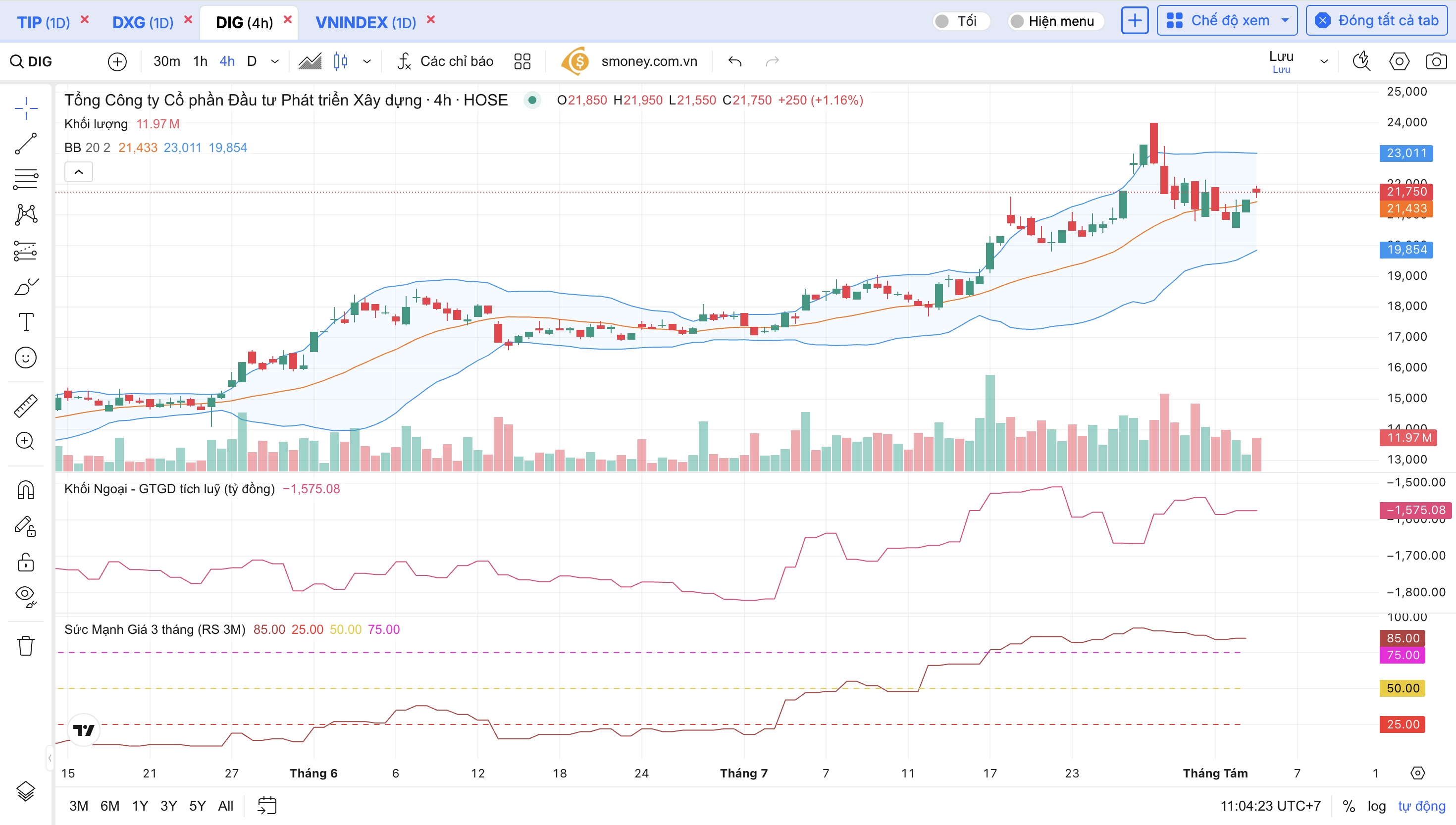 DIG đang mạnh dần theo thời gian. Nước Ngoài gom ròng 1 tháng nay. Sức mạnh Giá RS 3M giữ ổn định > 80 trong 2 tuần vừa qua.