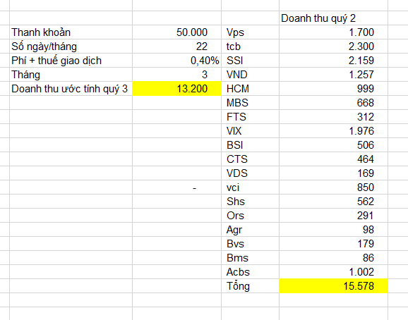 Hẹ hẹ, đang cao hứng CL lun, cứ cho là thanh khoảng quý 3 này là 50k tỉ đi, thì doanh thu quý 2 cũng đã ngáo VƯỢT XA doanh thu quý 3 ời và cổ phiếu đã phản ánh, giờ mn kì vọng vượt tiếp vì thanh khoản ??? kp bỗng dưng mình chỉ nhắc tới vci vs vnd thì 2 con này có các nghiệp vụ ngoài sàn :)) còn loại mà kéo con bo cung lên r khen nhau thì k chơi k tính nhé nhè nhẹ :))